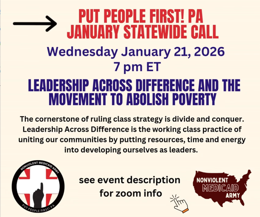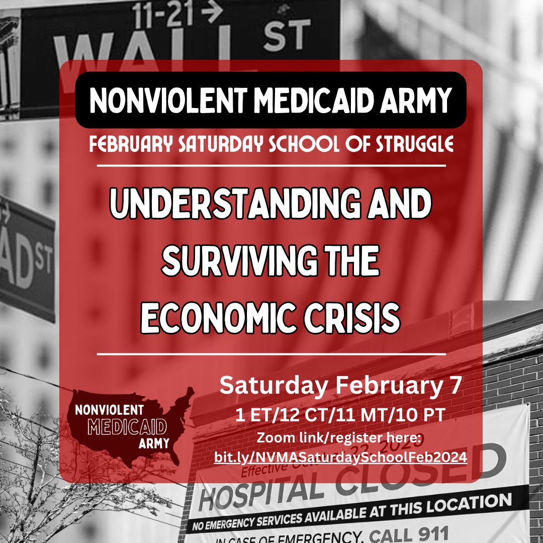 The February Saturday School with the Nonviolent Medicaid Army will look at what’s going on with jobs, prices, debt, and AI. We’ll talk about what’s really going on with our families and communities when it comes to the economy and our ability to survive. We’ll look at how we can unite for support, survival and strategy to get through this deepening crisis and build our movement to abolish poverty.Click here to RSVP & share on facebook.