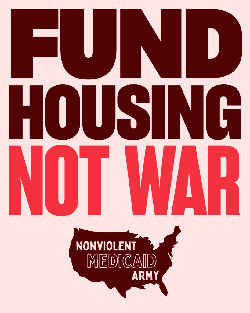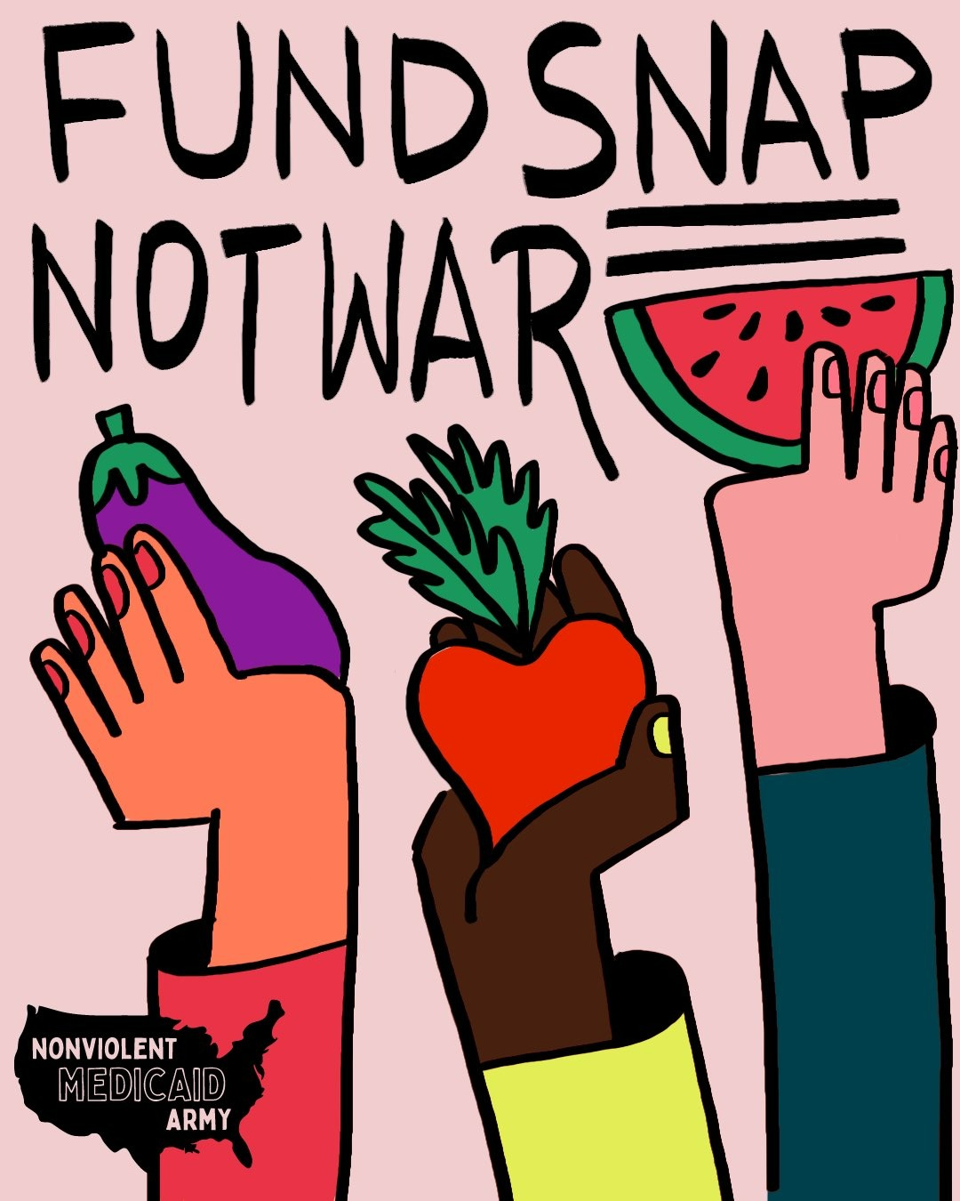 • Use hashtags #FundMedicaidNotWar #FundSNAPNotWar #FundHousingNotWar #UniteThePoor #NonviolentMedicaidArmy #MedicaidCutsEqualDeath