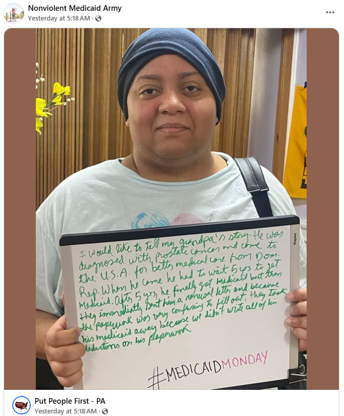 In addition to its statewide advocacy, Put People First! is also making sure that Pennsylvania’s congressional delegation hears from Medicaid recipients before casting their votes on the reconciliation bill. Its Nonviolent Medicaid Army is running a #MedicaidMonday social media campaign that invites people from across the country to share their stories of medical care, need, and neglect. Their message is clear and (one would hope) compelling: Taking away people’s healthcare is truly devastating.